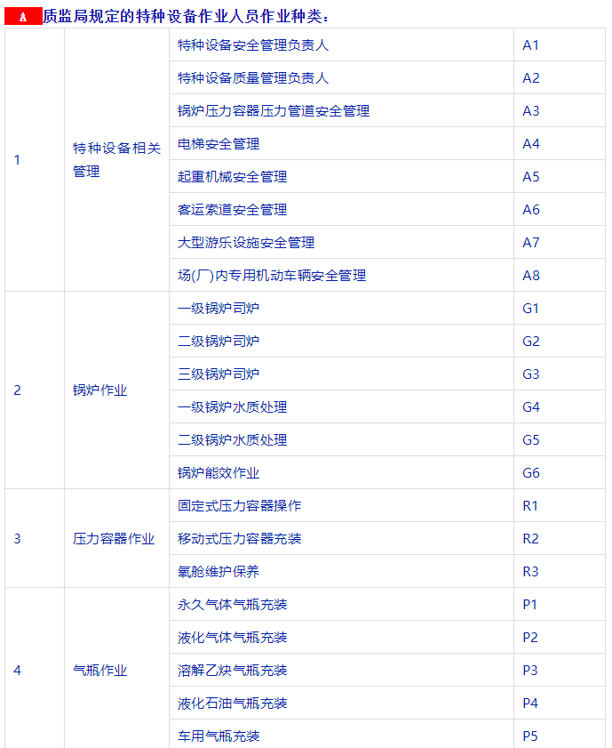 特種設(shè)備安全管理人員、叉車司機、起重機司機、起重機指揮、壓力容器、鍋爐、氣瓶充裝、電梯安裝與維修、觀光車、客運索道操作與修理、大型游樂設(shè)施操作與維修等等。