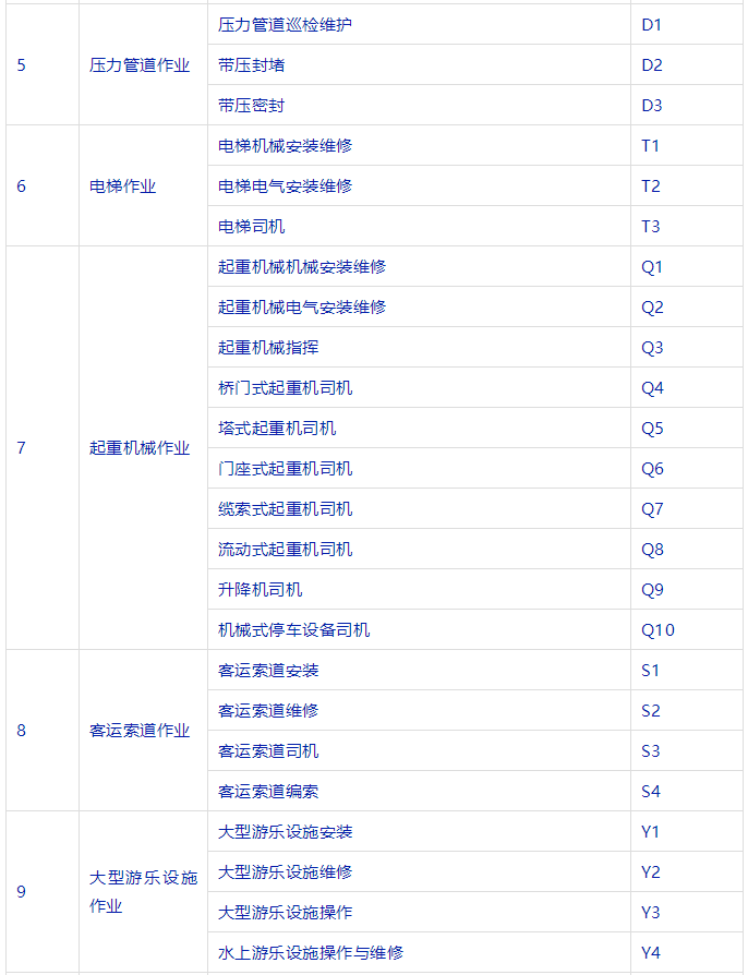 特種設(shè)備安全管理人員、叉車(chē)司機(jī)、起重機(jī)司機(jī)、起重機(jī)指揮、壓力容器、鍋爐、氣瓶充裝、電梯安裝與維修、觀光車(chē)、客運(yùn)索道操作與修理、大型游樂(lè)設(shè)施操作與維修等等。